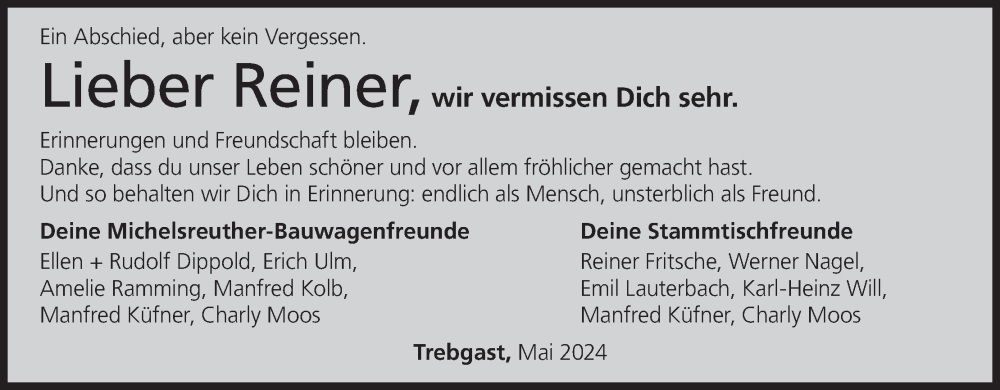 Hier finden Sie alle Traueranzeigen aus der Zeitung, die bisher für Reiner erschienen sind. Weitere Traueranzeigen, die in der Zeitung erscheinen, werden hier ebenfalls aufgelistet