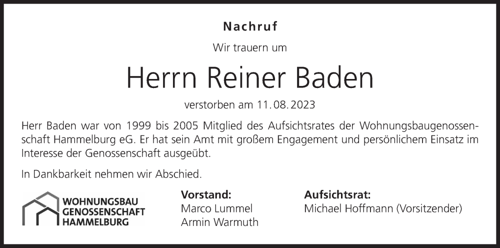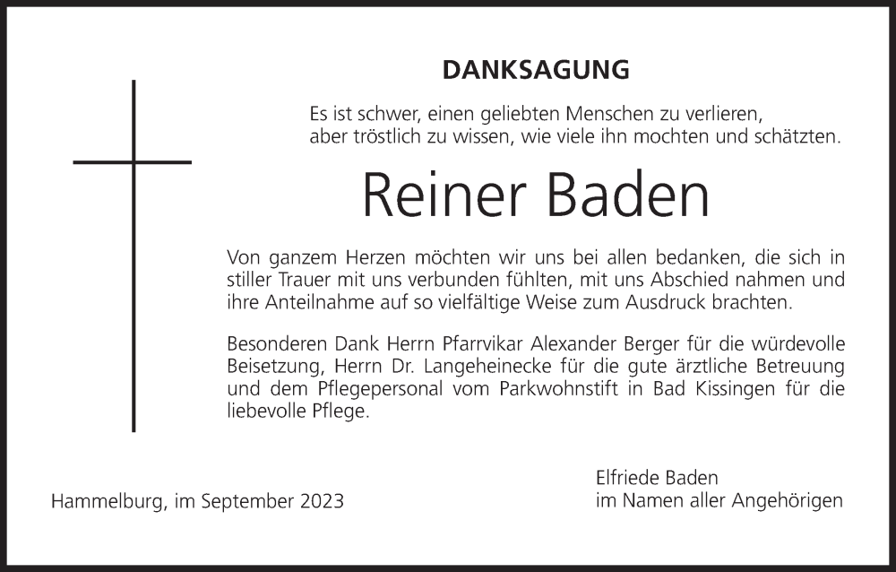 Hier finden Sie alle Traueranzeigen aus der Zeitung, die bisher für Reiner Baden erschienen sind. Weitere Traueranzeigen, die in der Zeitung erscheinen, werden hier ebenfalls aufgelistet