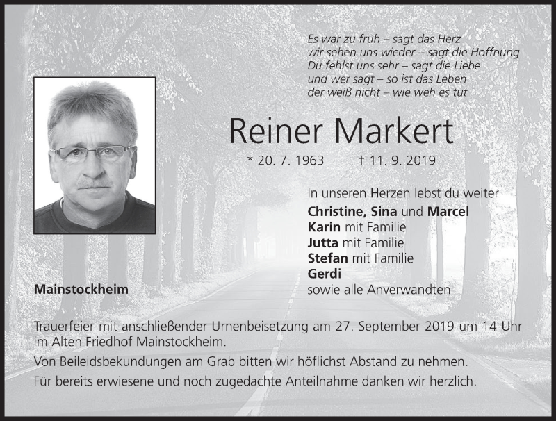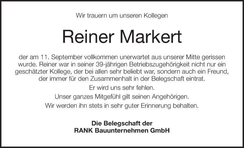 Hier finden Sie alle Traueranzeigen aus der Zeitung, die bisher für Reiner Markert erschienen sind. Weitere Traueranzeigen, die in der Zeitung erscheinen, werden hier ebenfalls aufgelistet
