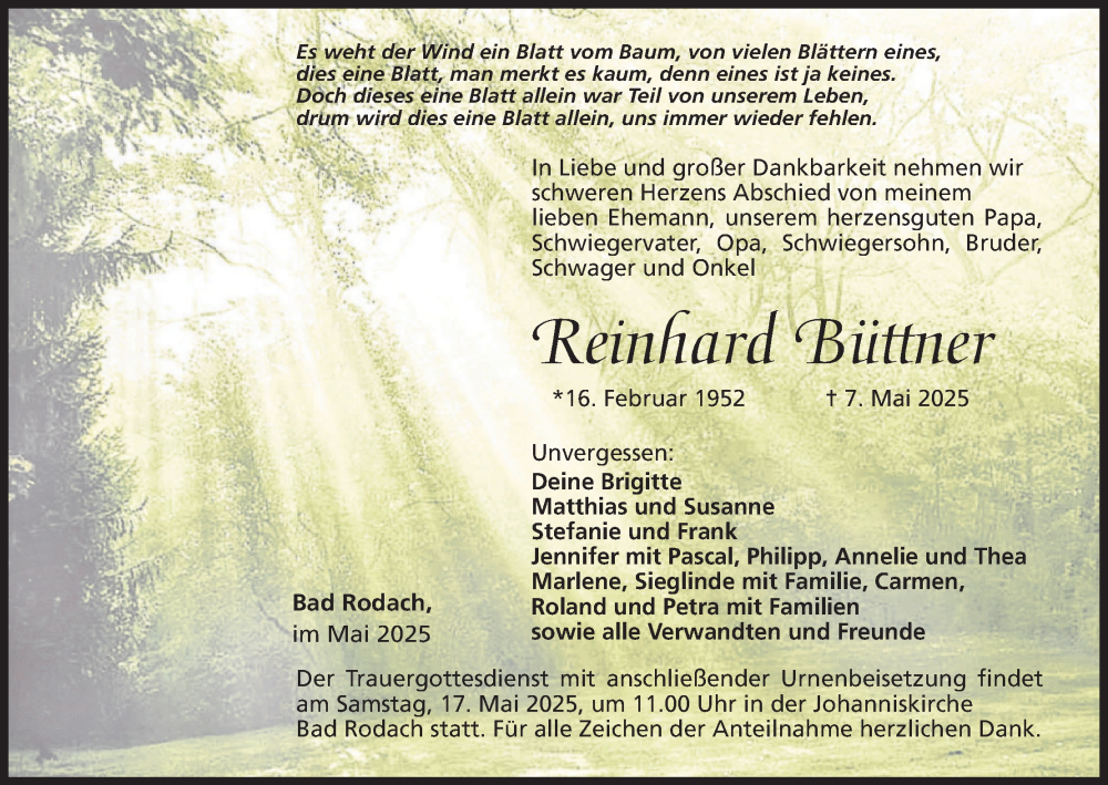 Hier finden Sie alle Traueranzeigen aus der Zeitung, die bisher für Reinhard Büttner erschienen sind. Weitere Traueranzeigen, die in der Zeitung erscheinen, werden hier ebenfalls aufgelistet