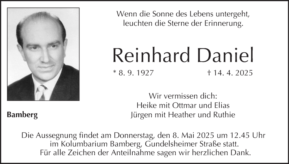 Hier finden Sie alle Traueranzeigen aus der Zeitung, die bisher für Reinhard Daniel erschienen sind. Weitere Traueranzeigen, die in der Zeitung erscheinen, werden hier ebenfalls aufgelistet