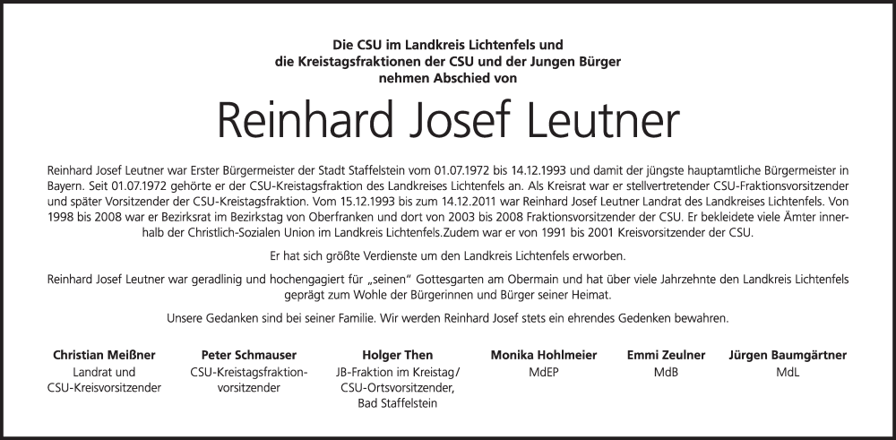 Hier finden Sie alle Traueranzeigen aus der Zeitung, die bisher für Reinhard Josef Leutner erschienen sind. Weitere Traueranzeigen, die in der Zeitung erscheinen, werden hier ebenfalls aufgelistet