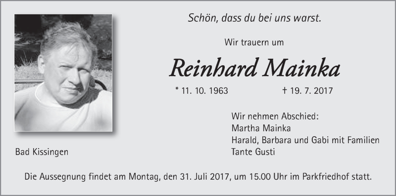 Hier finden Sie alle Traueranzeigen aus der Zeitung, die bisher für Reinhard Mainka erschienen sind. Weitere Traueranzeigen, die in der Zeitung erscheinen, werden hier ebenfalls aufgelistet