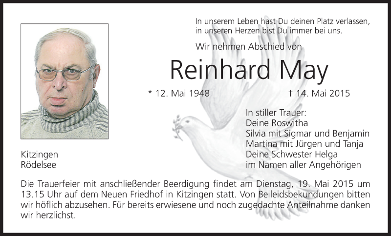 Hier finden Sie alle Traueranzeigen aus der Zeitung, die bisher für Reinhard May erschienen sind. Weitere Traueranzeigen, die in der Zeitung erscheinen, werden hier ebenfalls aufgelistet