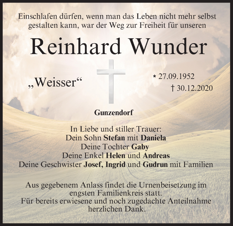 Hier finden Sie alle Traueranzeigen aus der Zeitung, die bisher für Reinhard Wunder erschienen sind. Weitere Traueranzeigen, die in der Zeitung erscheinen, werden hier ebenfalls aufgelistet