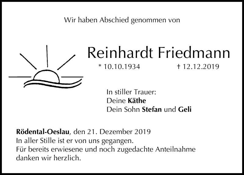 Hier finden Sie alle Traueranzeigen aus der Zeitung, die bisher für Reinhardt Friedmann erschienen sind. Weitere Traueranzeigen, die in der Zeitung erscheinen, werden hier ebenfalls aufgelistet