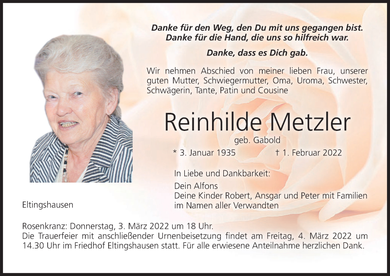 Hier finden Sie alle Traueranzeigen aus der Zeitung, die bisher für Reinhilde Metzler erschienen sind. Weitere Traueranzeigen, die in der Zeitung erscheinen, werden hier ebenfalls aufgelistet