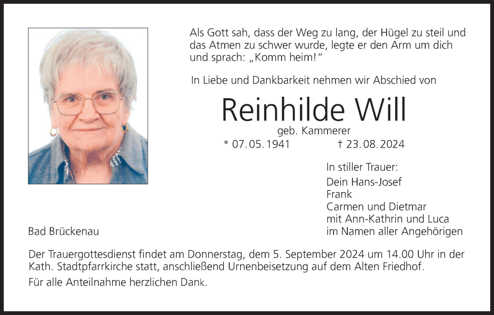 Hier finden Sie alle Traueranzeigen aus der Zeitung, die bisher für Reinhilde Will erschienen sind. Weitere Traueranzeigen, die in der Zeitung erscheinen, werden hier ebenfalls aufgelistet