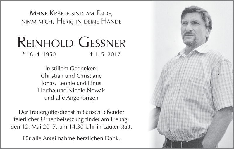 Hier finden Sie alle Traueranzeigen aus der Zeitung, die bisher für Reinhold Gessner erschienen sind. Weitere Traueranzeigen, die in der Zeitung erscheinen, werden hier ebenfalls aufgelistet