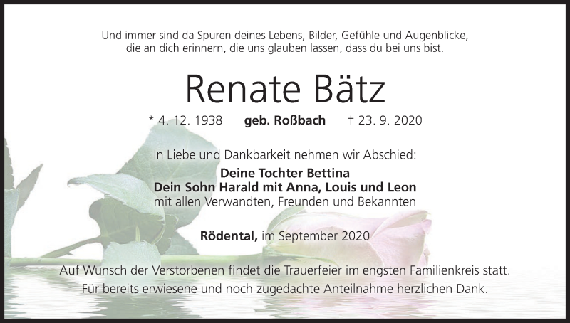Hier finden Sie alle Traueranzeigen aus der Zeitung, die bisher für Renate Bätz erschienen sind. Weitere Traueranzeigen, die in der Zeitung erscheinen, werden hier ebenfalls aufgelistet