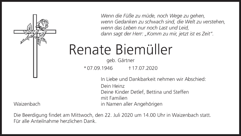 Hier finden Sie alle Traueranzeigen aus der Zeitung, die bisher für Renate Biemüller erschienen sind. Weitere Traueranzeigen, die in der Zeitung erscheinen, werden hier ebenfalls aufgelistet