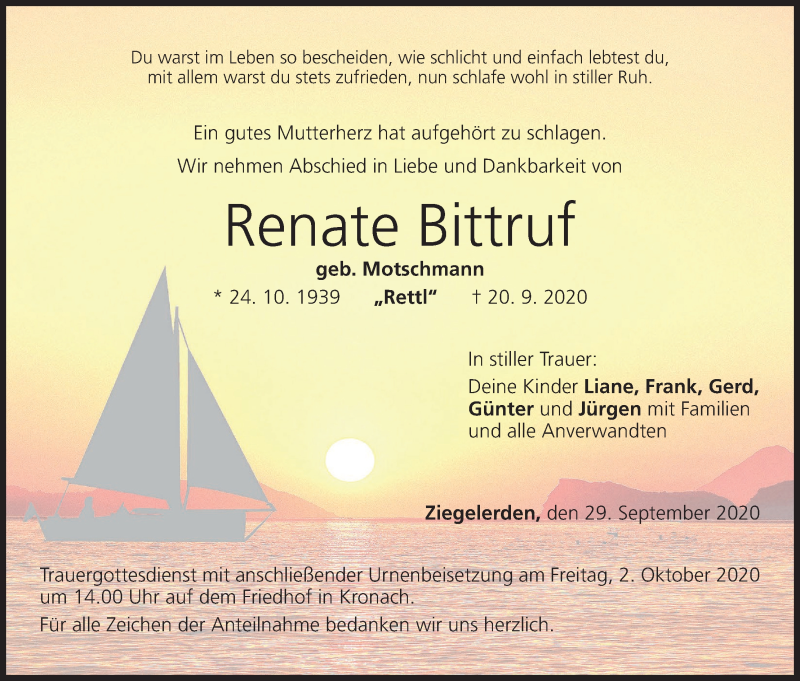 Hier finden Sie alle Traueranzeigen aus der Zeitung, die bisher für Renate Bittruf erschienen sind. Weitere Traueranzeigen, die in der Zeitung erscheinen, werden hier ebenfalls aufgelistet