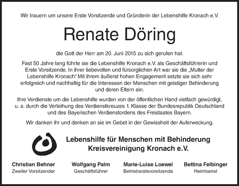 Hier finden Sie alle Traueranzeigen aus der Zeitung, die bisher für Renate Döring erschienen sind. Weitere Traueranzeigen, die in der Zeitung erscheinen, werden hier ebenfalls aufgelistet