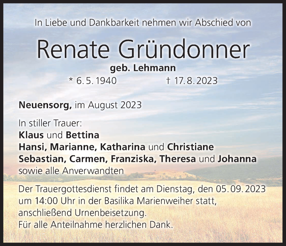 Hier finden Sie alle Traueranzeigen aus der Zeitung, die bisher für Renate Gründonner erschienen sind. Weitere Traueranzeigen, die in der Zeitung erscheinen, werden hier ebenfalls aufgelistet