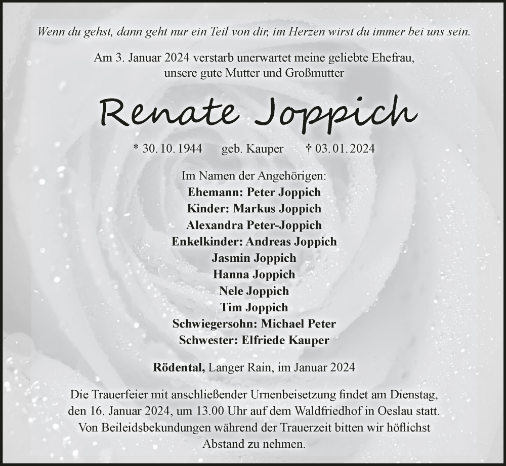 Hier finden Sie alle Traueranzeigen aus der Zeitung, die bisher für Renate Joppich erschienen sind. Weitere Traueranzeigen, die in der Zeitung erscheinen, werden hier ebenfalls aufgelistet