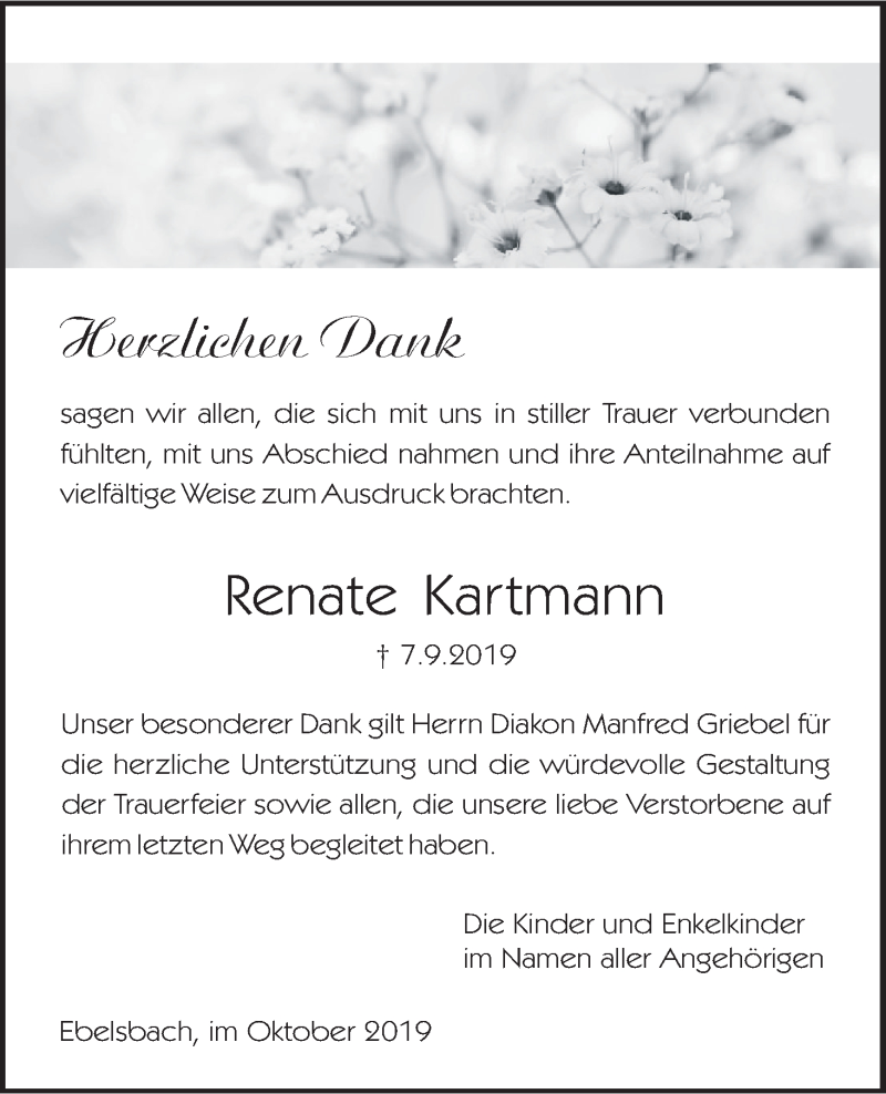 Hier finden Sie alle Traueranzeigen aus der Zeitung, die bisher für Renate Kartmann erschienen sind. Weitere Traueranzeigen, die in der Zeitung erscheinen, werden hier ebenfalls aufgelistet