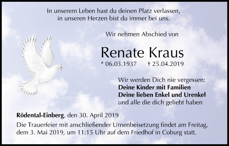 Hier finden Sie alle Traueranzeigen aus der Zeitung, die bisher für Renate Kraus erschienen sind. Weitere Traueranzeigen, die in der Zeitung erscheinen, werden hier ebenfalls aufgelistet