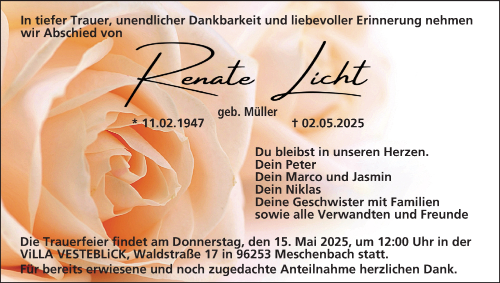 Hier finden Sie alle Traueranzeigen aus der Zeitung, die bisher für Renate Licht erschienen sind. Weitere Traueranzeigen, die in der Zeitung erscheinen, werden hier ebenfalls aufgelistet
