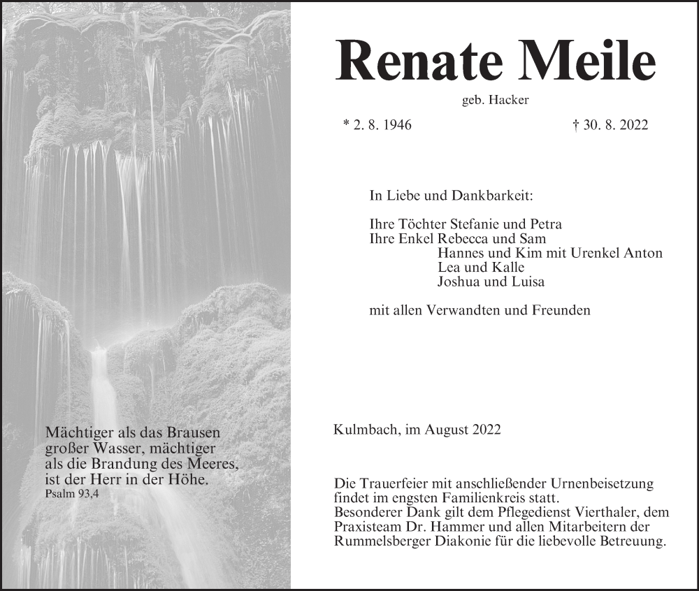 Hier finden Sie alle Traueranzeigen aus der Zeitung, die bisher für Renate Meile erschienen sind. Weitere Traueranzeigen, die in der Zeitung erscheinen, werden hier ebenfalls aufgelistet