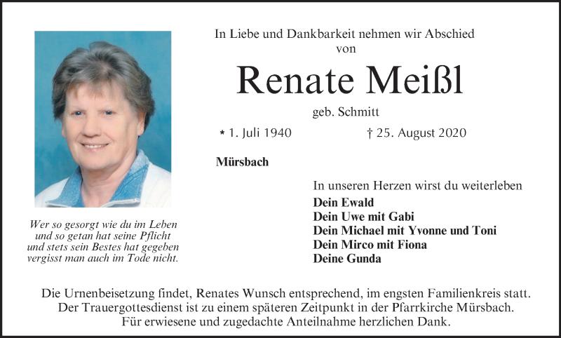 Hier finden Sie alle Traueranzeigen aus der Zeitung, die bisher für Renate Meißl erschienen sind. Weitere Traueranzeigen, die in der Zeitung erscheinen, werden hier ebenfalls aufgelistet