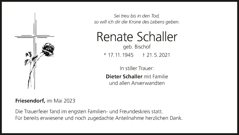 Hier finden Sie alle Traueranzeigen aus der Zeitung, die bisher für Renate Schaller erschienen sind. Weitere Traueranzeigen, die in der Zeitung erscheinen, werden hier ebenfalls aufgelistet