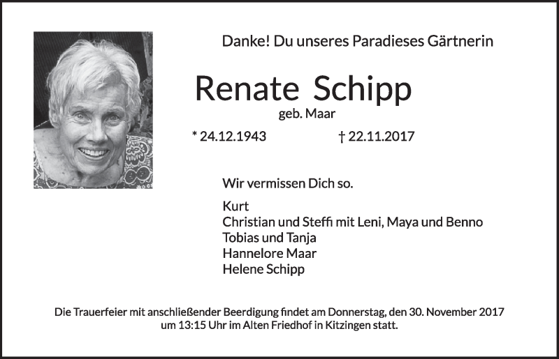 Hier finden Sie alle Traueranzeigen aus der Zeitung, die bisher für Renate Schipp erschienen sind. Weitere Traueranzeigen, die in der Zeitung erscheinen, werden hier ebenfalls aufgelistet