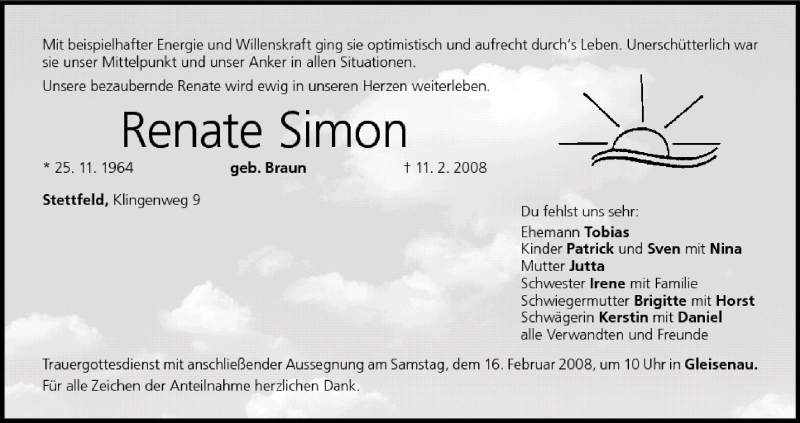 Hier finden Sie alle Traueranzeigen aus der Zeitung, die bisher für Renate Simon erschienen sind. Weitere Traueranzeigen, die in der Zeitung erscheinen, werden hier ebenfalls aufgelistet
