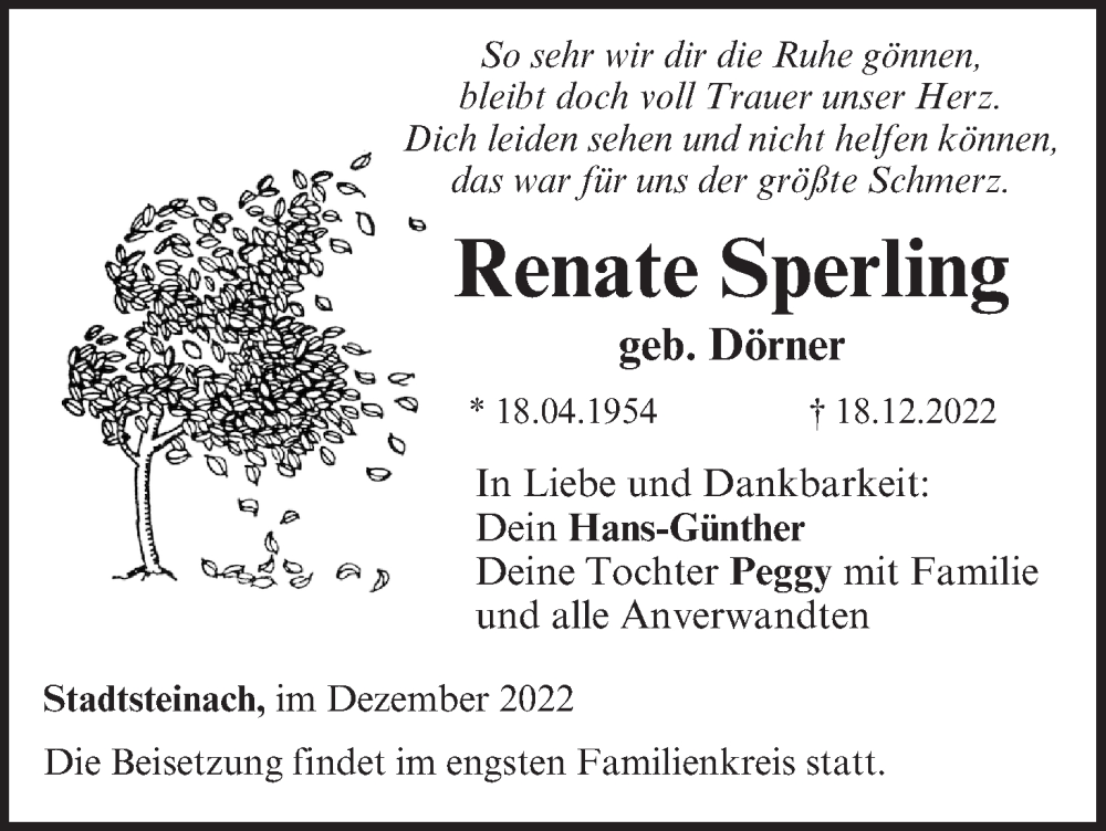Hier finden Sie alle Traueranzeigen aus der Zeitung, die bisher für Renate Sperling erschienen sind. Weitere Traueranzeigen, die in der Zeitung erscheinen, werden hier ebenfalls aufgelistet