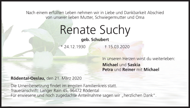 Hier finden Sie alle Traueranzeigen aus der Zeitung, die bisher für Renate Suchy erschienen sind. Weitere Traueranzeigen, die in der Zeitung erscheinen, werden hier ebenfalls aufgelistet