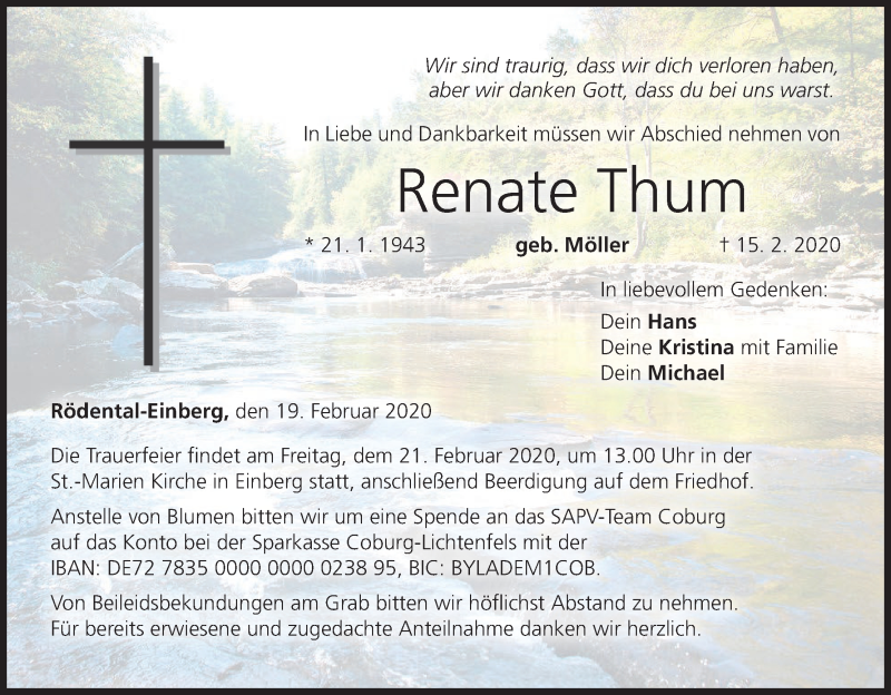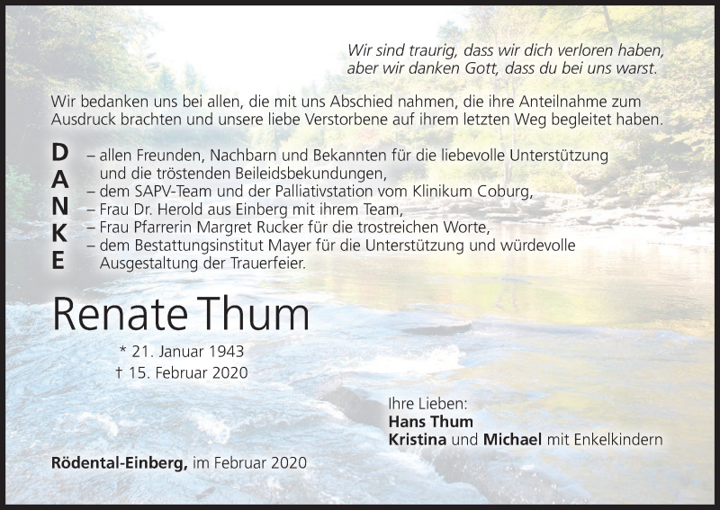 Hier finden Sie alle Traueranzeigen aus der Zeitung, die bisher für Renate Thum erschienen sind. Weitere Traueranzeigen, die in der Zeitung erscheinen, werden hier ebenfalls aufgelistet