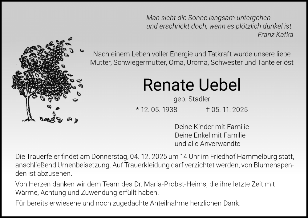 Hier finden Sie alle Traueranzeigen aus der Zeitung, die bisher für Renate Uebel erschienen sind. Weitere Traueranzeigen, die in der Zeitung erscheinen, werden hier ebenfalls aufgelistet