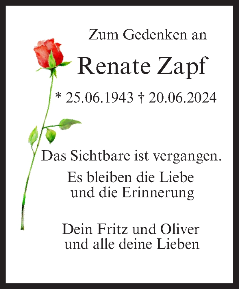 Hier finden Sie alle Traueranzeigen aus der Zeitung, die bisher für Renate Zapf erschienen sind. Weitere Traueranzeigen, die in der Zeitung erscheinen, werden hier ebenfalls aufgelistet