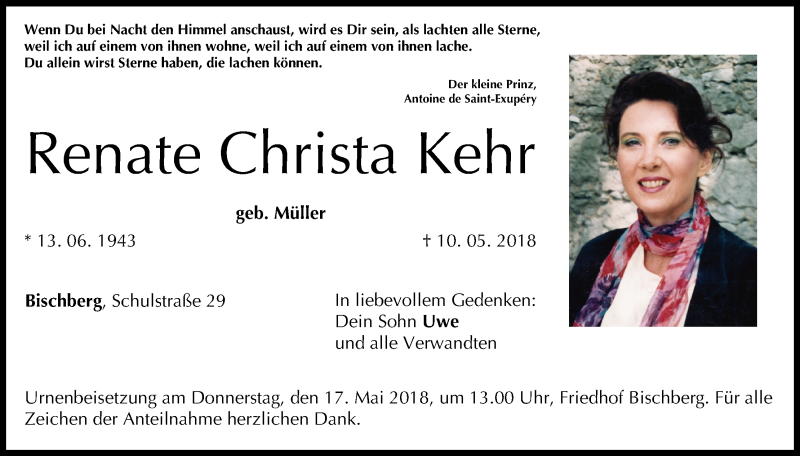 Hier finden Sie alle Traueranzeigen aus der Zeitung, die bisher für Renate Christa Kehr erschienen sind. Weitere Traueranzeigen, die in der Zeitung erscheinen, werden hier ebenfalls aufgelistet