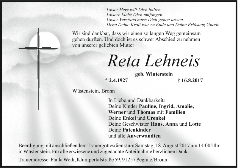 Hier finden Sie alle Traueranzeigen aus der Zeitung, die bisher für Reta Lehneis erschienen sind. Weitere Traueranzeigen, die in der Zeitung erscheinen, werden hier ebenfalls aufgelistet