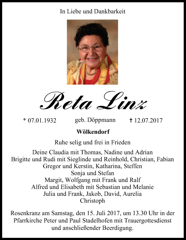 Hier finden Sie alle Traueranzeigen aus der Zeitung, die bisher für Reta Linz erschienen sind. Weitere Traueranzeigen, die in der Zeitung erscheinen, werden hier ebenfalls aufgelistet