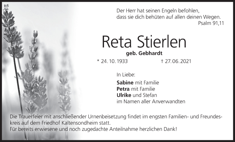 Hier finden Sie alle Traueranzeigen aus der Zeitung, die bisher für Reta Stierlen erschienen sind. Weitere Traueranzeigen, die in der Zeitung erscheinen, werden hier ebenfalls aufgelistet
