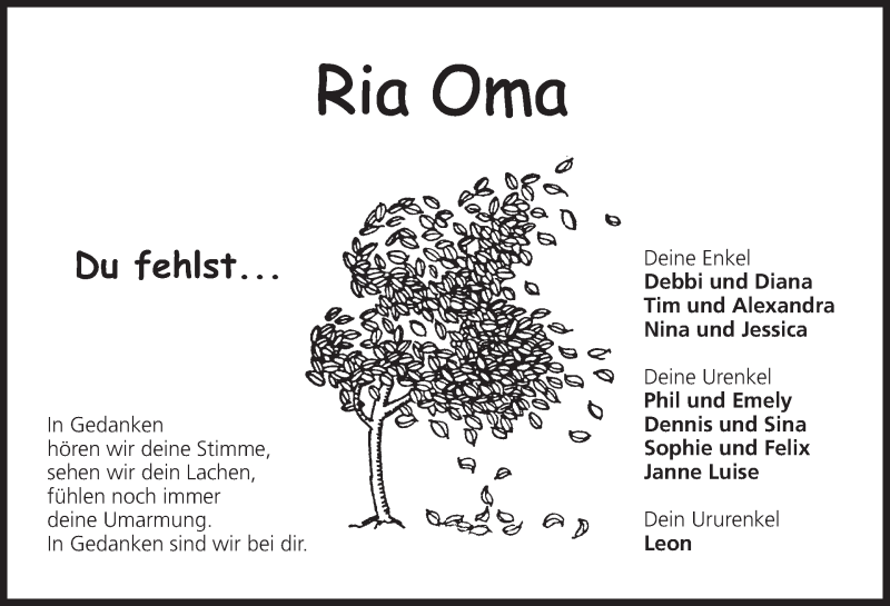 Hier finden Sie alle Traueranzeigen aus der Zeitung, die bisher für Ria erschienen sind. Weitere Traueranzeigen, die in der Zeitung erscheinen, werden hier ebenfalls aufgelistet