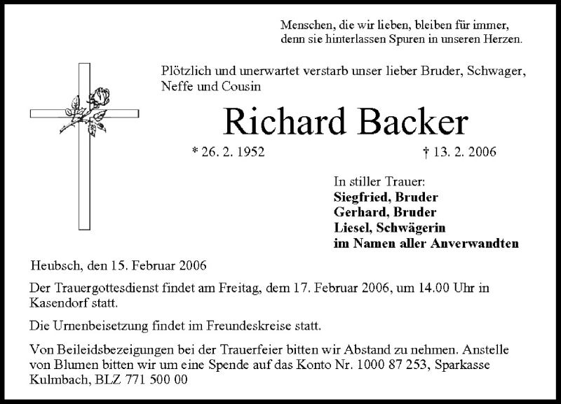Hier finden Sie alle Traueranzeigen aus der Zeitung, die bisher für Richard Backer erschienen sind. Weitere Traueranzeigen, die in der Zeitung erscheinen, werden hier ebenfalls aufgelistet