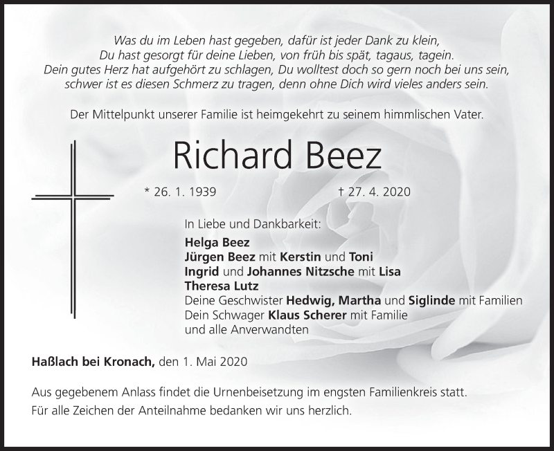Hier finden Sie alle Traueranzeigen aus der Zeitung, die bisher für Richard Beez erschienen sind. Weitere Traueranzeigen, die in der Zeitung erscheinen, werden hier ebenfalls aufgelistet