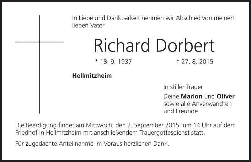Hier finden Sie alle Traueranzeigen aus der Zeitung, die bisher für Richard Dorbert erschienen sind. Weitere Traueranzeigen, die in der Zeitung erscheinen, werden hier ebenfalls aufgelistet