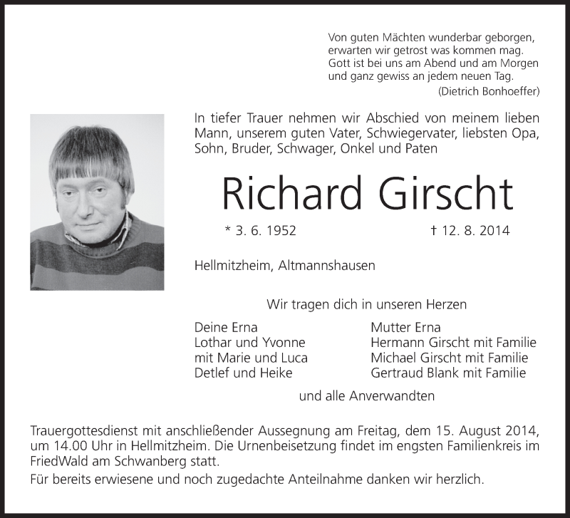 Hier finden Sie alle Traueranzeigen aus der Zeitung, die bisher für Richard Girscht erschienen sind. Weitere Traueranzeigen, die in der Zeitung erscheinen, werden hier ebenfalls aufgelistet