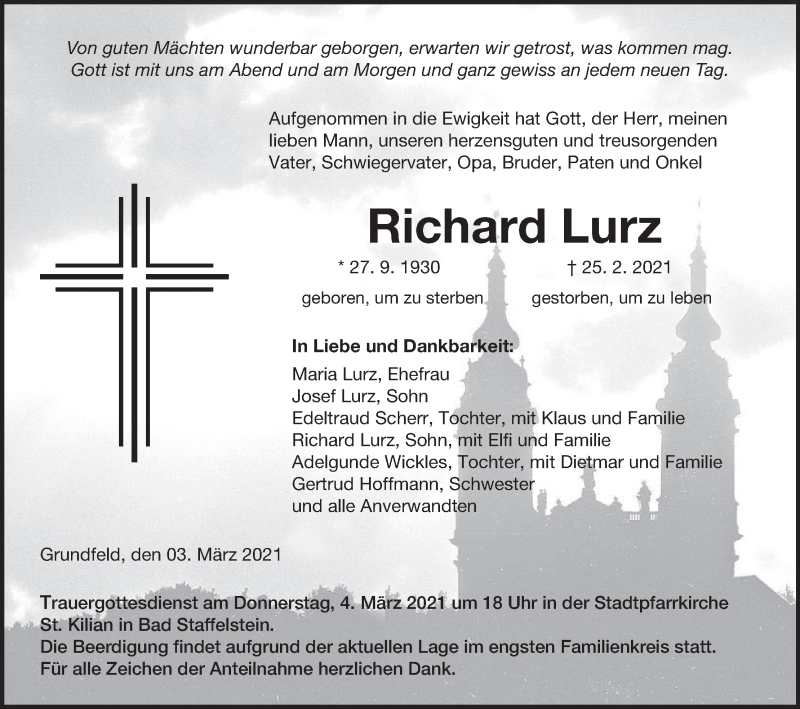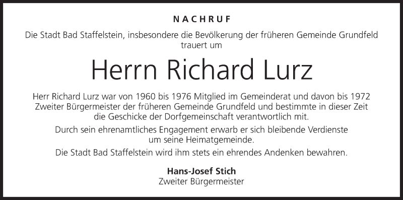 Hier finden Sie alle Traueranzeigen aus der Zeitung, die bisher für Richard Lurz erschienen sind. Weitere Traueranzeigen, die in der Zeitung erscheinen, werden hier ebenfalls aufgelistet