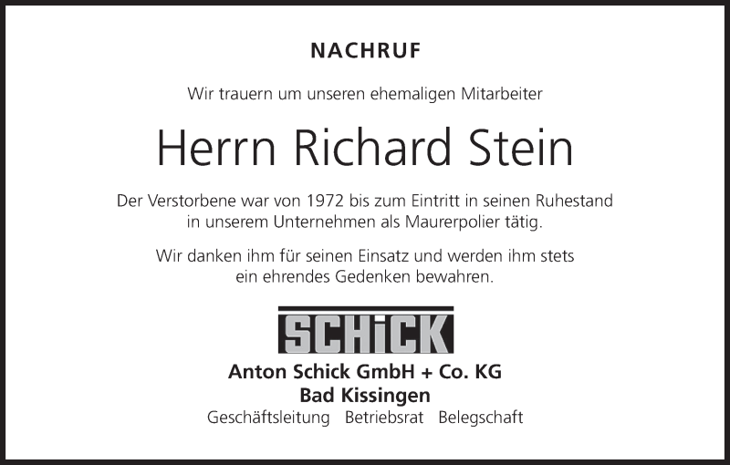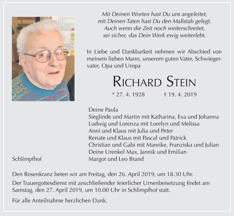 Hier finden Sie alle Traueranzeigen aus der Zeitung, die bisher für Richard Stein erschienen sind. Weitere Traueranzeigen, die in der Zeitung erscheinen, werden hier ebenfalls aufgelistet