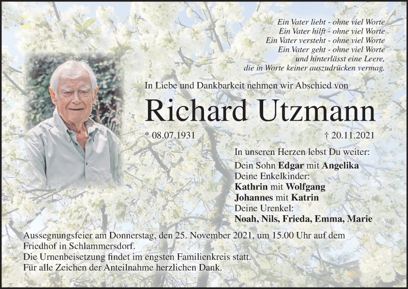 Hier finden Sie alle Traueranzeigen aus der Zeitung, die bisher für Richard Utzmann erschienen sind. Weitere Traueranzeigen, die in der Zeitung erscheinen, werden hier ebenfalls aufgelistet