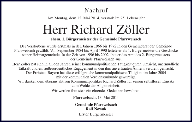 Hier finden Sie alle Traueranzeigen aus der Zeitung, die bisher für Richard Zöller erschienen sind. Weitere Traueranzeigen, die in der Zeitung erscheinen, werden hier ebenfalls aufgelistet