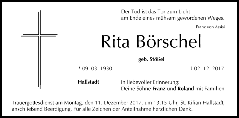 Hier finden Sie alle Traueranzeigen aus der Zeitung, die bisher für Rita Börschel erschienen sind. Weitere Traueranzeigen, die in der Zeitung erscheinen, werden hier ebenfalls aufgelistet