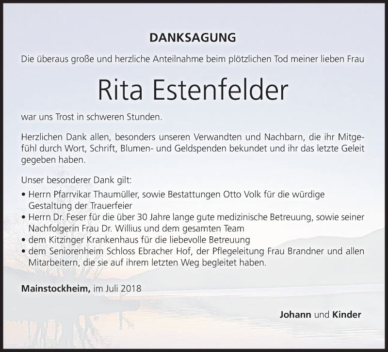 Hier finden Sie alle Traueranzeigen aus der Zeitung, die bisher für Rita Estenfelder erschienen sind. Weitere Traueranzeigen, die in der Zeitung erscheinen, werden hier ebenfalls aufgelistet