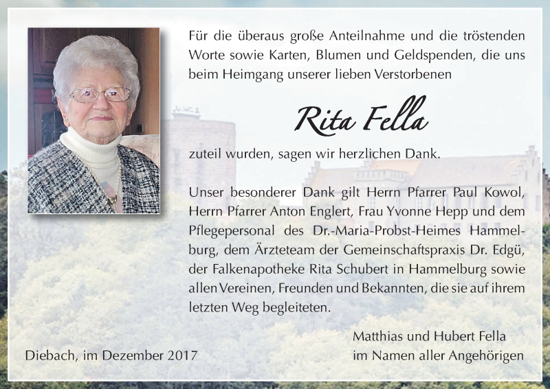Hier finden Sie alle Traueranzeigen aus der Zeitung, die bisher für Rita Fella erschienen sind. Weitere Traueranzeigen, die in der Zeitung erscheinen, werden hier ebenfalls aufgelistet