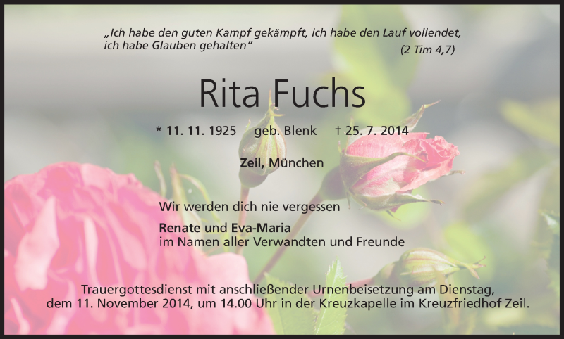 Hier finden Sie alle Traueranzeigen aus der Zeitung, die bisher für Rita Fuchs erschienen sind. Weitere Traueranzeigen, die in der Zeitung erscheinen, werden hier ebenfalls aufgelistet