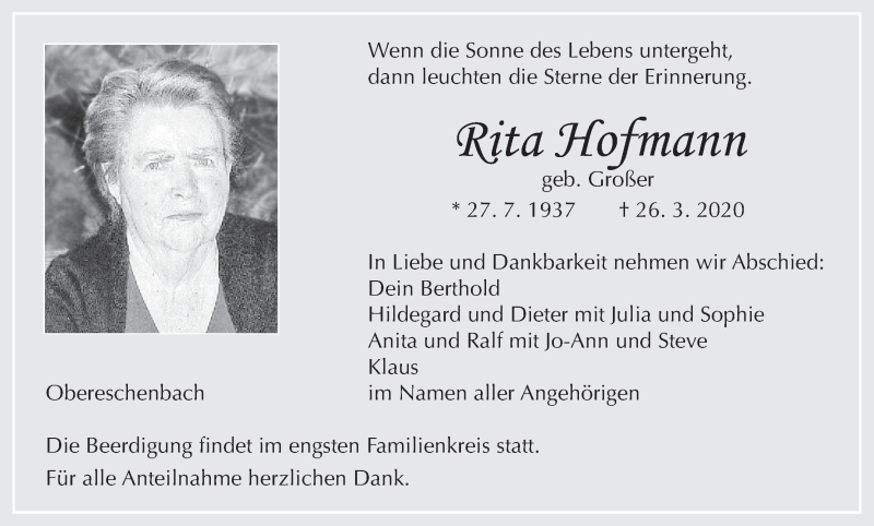 Hier finden Sie alle Traueranzeigen aus der Zeitung, die bisher für Rita Hofmann erschienen sind. Weitere Traueranzeigen, die in der Zeitung erscheinen, werden hier ebenfalls aufgelistet